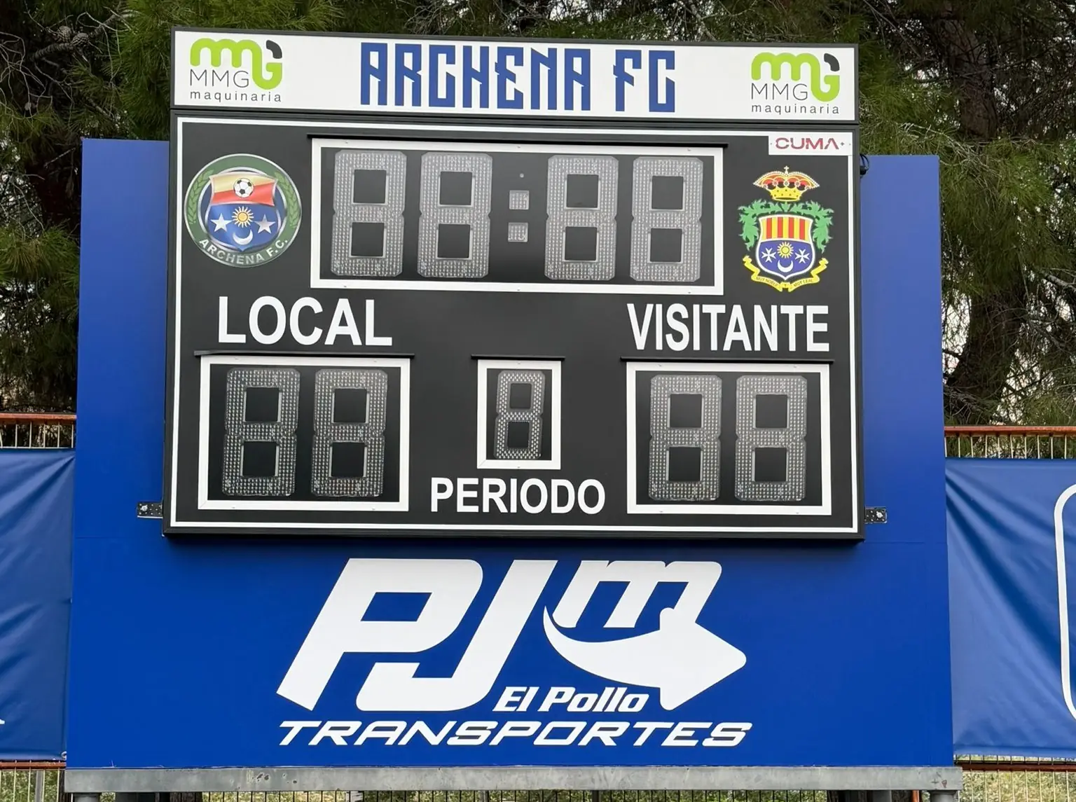 MMG Maquinaria, patrocinador oficial del Archena CF, ha confiado en CUMA para la adquisición de un marcador electrónico LED de fútbol, diseñado para ofrecer máxima visibilidad, fiabilidad y un funcionamiento óptimo en sus instalaciones deportivas.